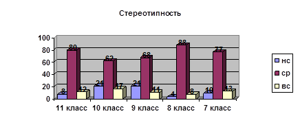 На диаграмме мы видим, что наибольшая степень стереотипности у 7 класса. С точки зрения возрастной психологии это можно объяснить следующим образом: для подростка очень важно ничем не отличаться от группы (я как все). Этот возраст характеризуется стремлением к "единому" мышлению, желанием не выделяться.
